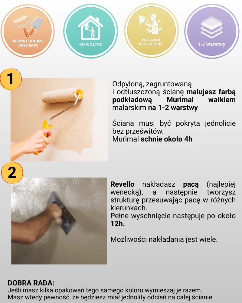 - Einfach aufzutragen, wobei der endgültige Effekt von der Beleuchtung abhängt, was eine individuelle Raumgestaltung ermöglicht.