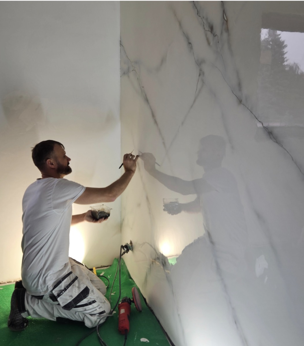 Gray veins are achieved by the expert mixing black stucco with white in chosen proportions. Often, they create 2-3 shades of gray, so ordering 1 kg for an element that uses only 100 grams doesn’t make sense.