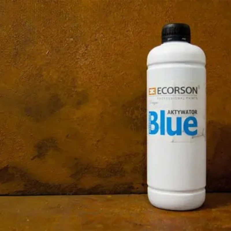 Aktywator Blue Ecorson został opracowany z myślą o uzyskaniu efektów dekoracyjnych w postaci charakterystycznych przebarwień oraz przyspieszeniu procesu rdzewienia dekoracyjnej masy Oxidecor E.