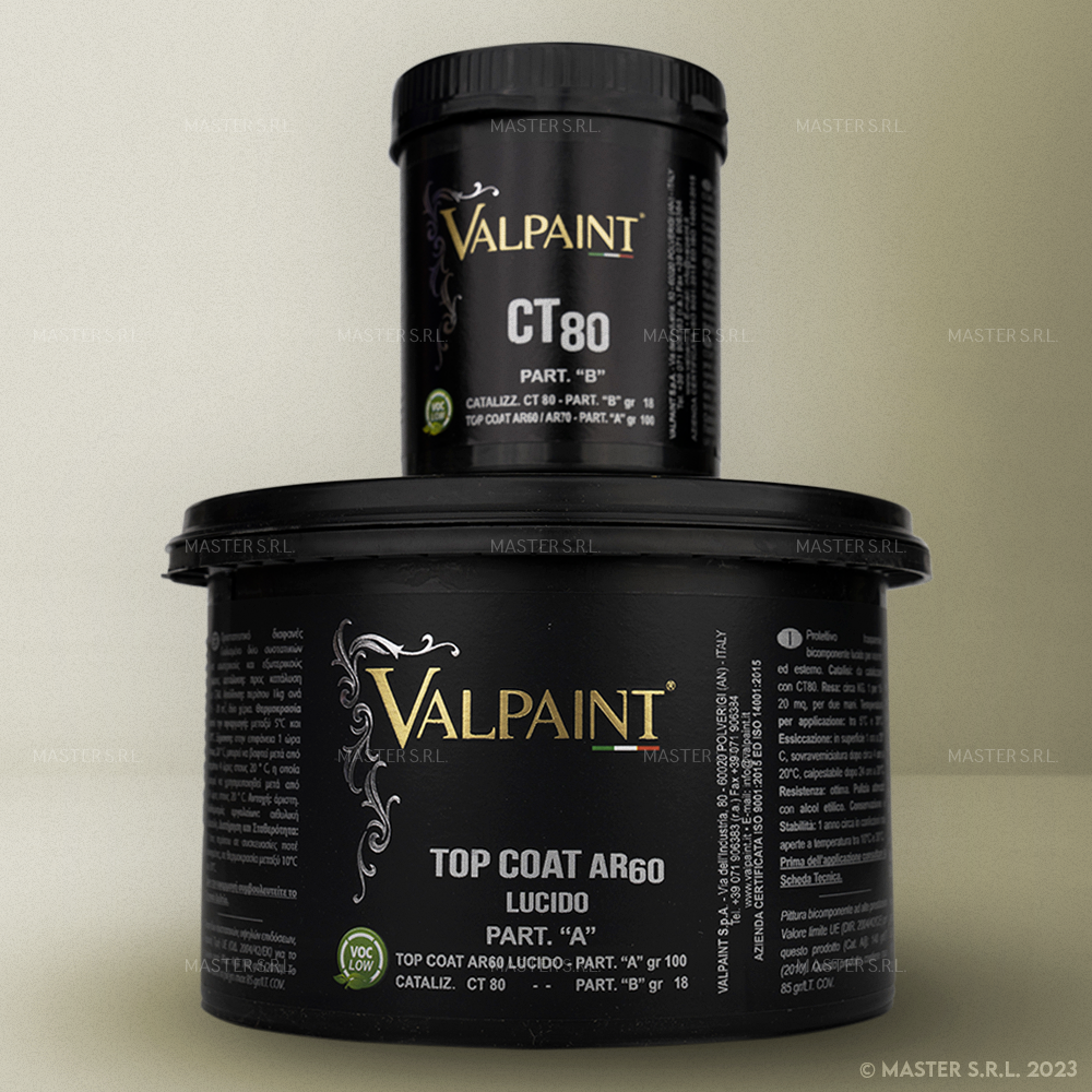 Dwuskładnikowy lakier Kit Top Coat Valpaint jest to bezbarwny lakier wykończeniowy, przeznaczony do stosowania jako dodatkowa warstwa ochronna na dekoracyjnych powierzchniach Valpaint.
