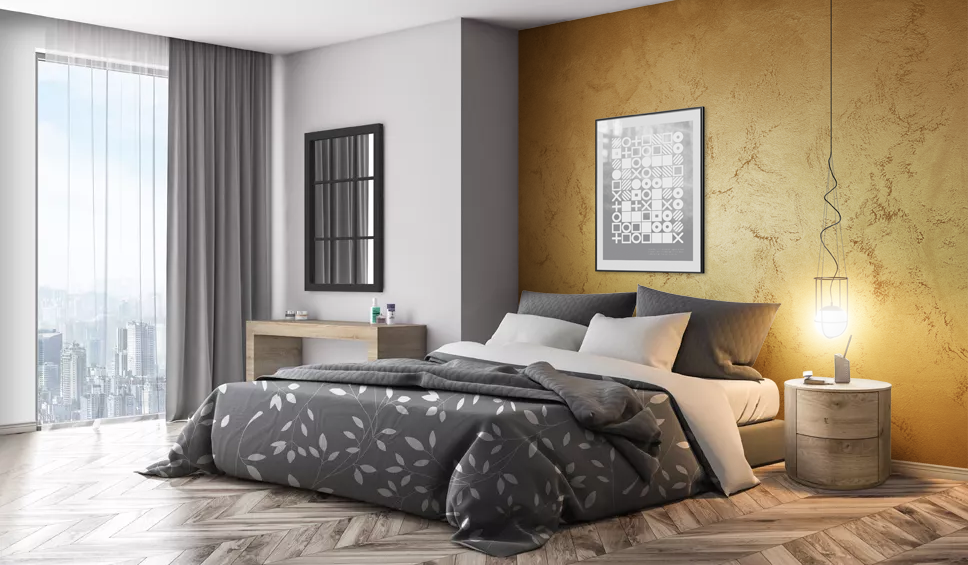 - Efekt mieniącego się piasku pustyni o poświacie złotej dodaje wnętrzom niepowtarzalnego charakteru.