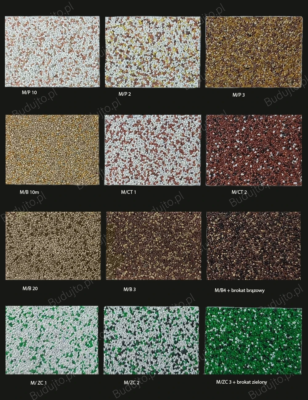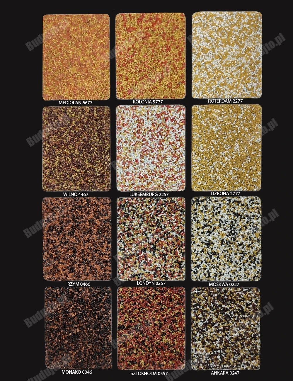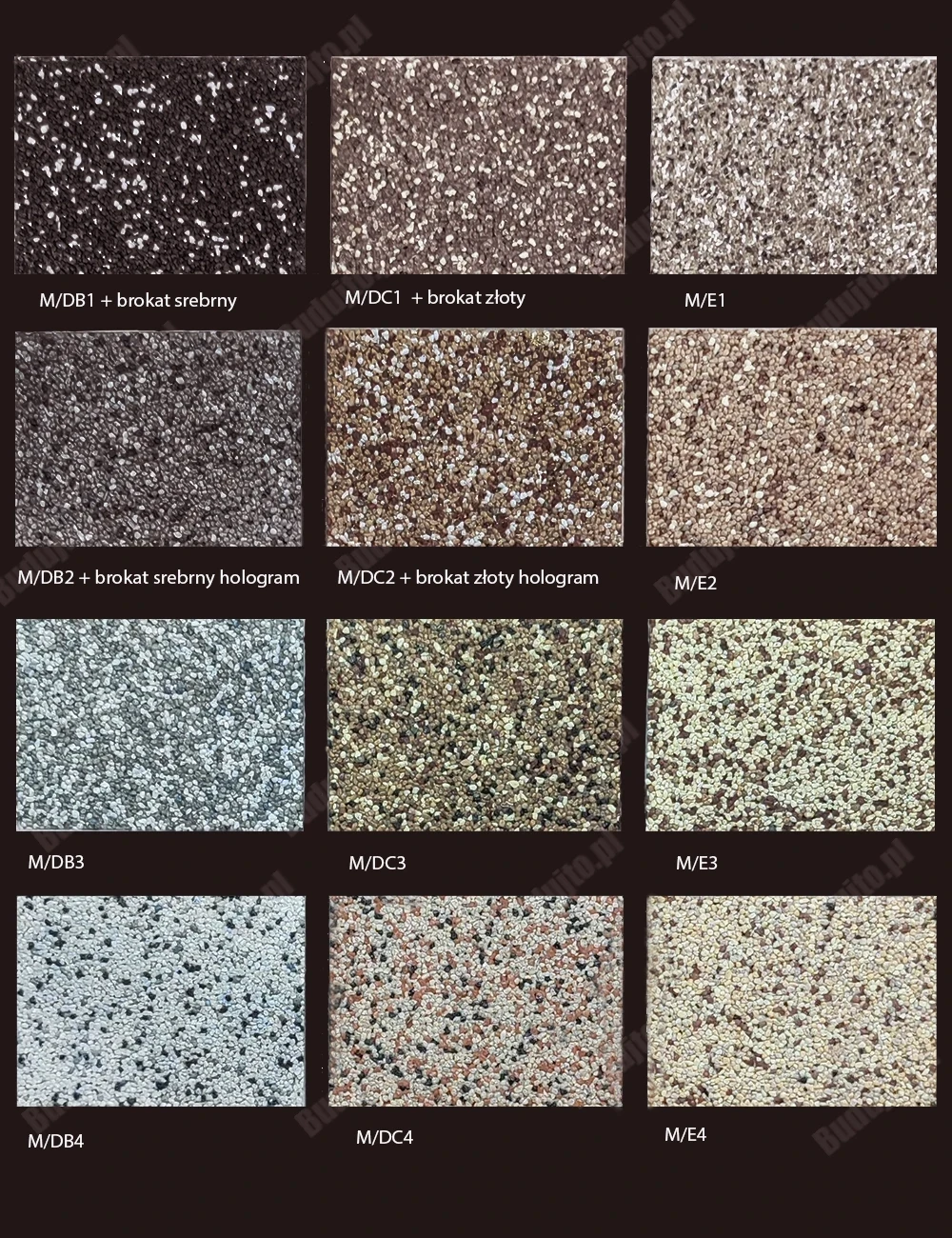 **Zdjęcia wzornika mają charakter poglądowy i mogą nieznacznie różnić się od rzeczywistych, może to być spowodowane ustawieniami monitora i/lub karty graficznej. Podobnie jest z ilością dodatków w próbkach, która jest poglądowa i może się różnić od znormowanej ilości wrzucanej do wiadra 25 kg.