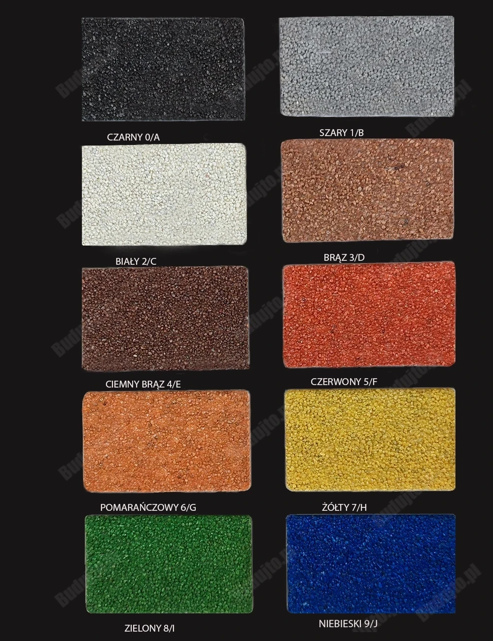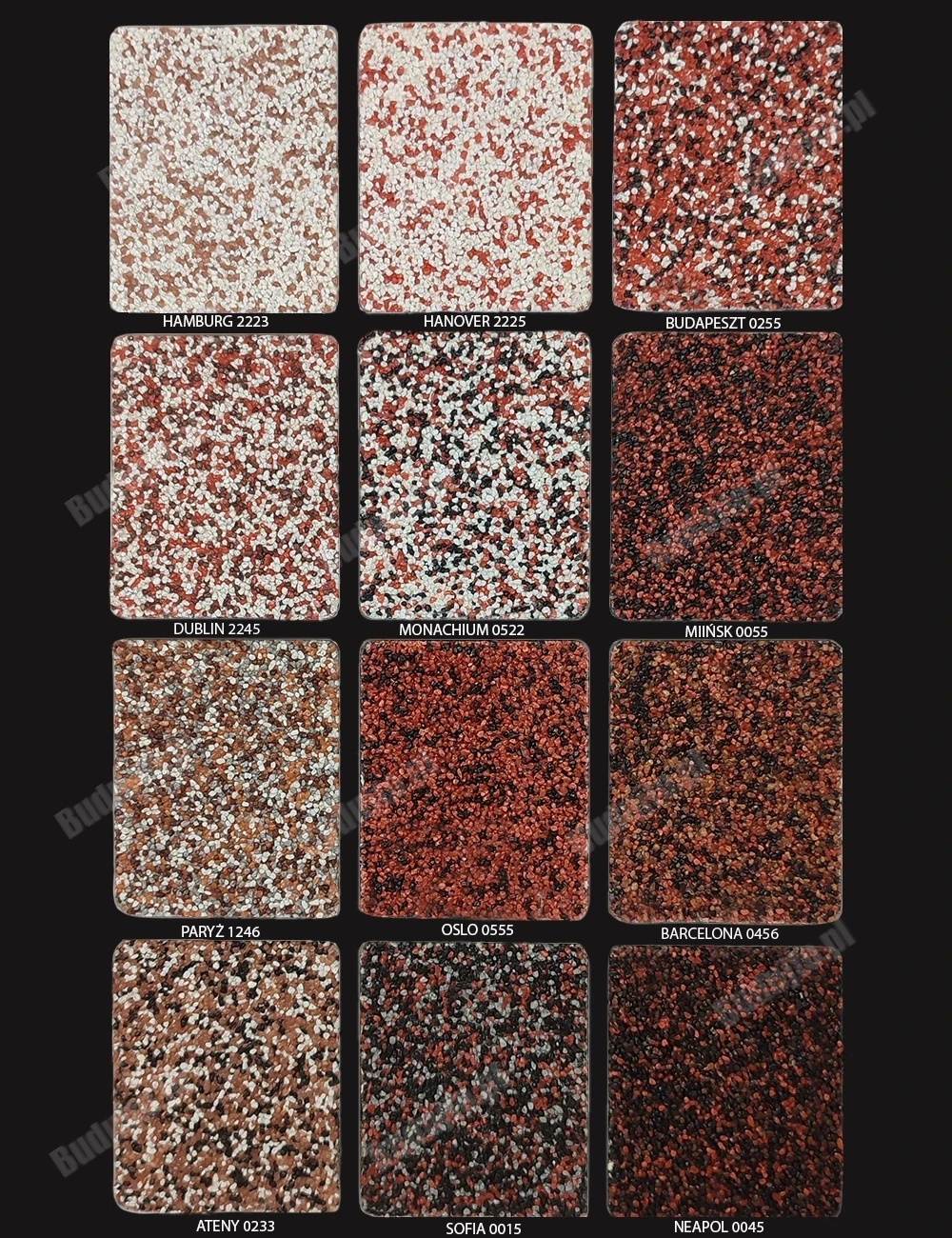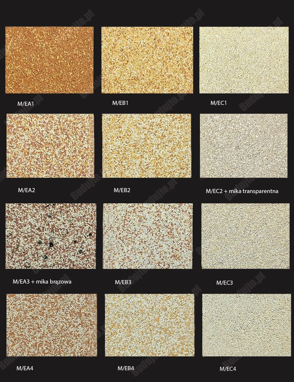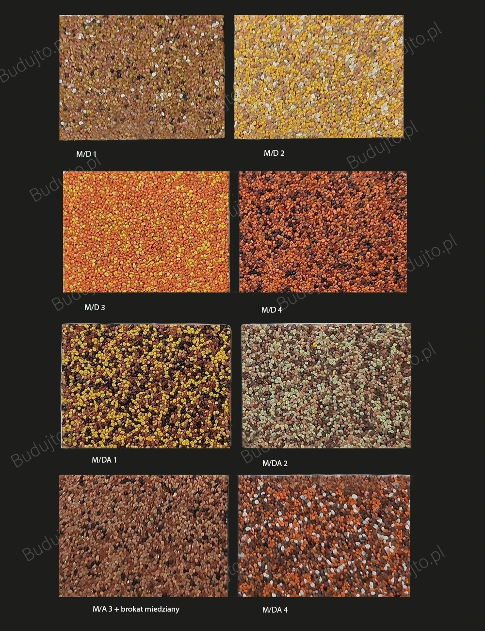 **Zdjęcia wzornika mają charakter poglądowy i mogą nieznacznie różnić się od rzeczywistych, może to być spowodowane ustawieniami monitora i/lub karty graficznej. Podobnie jest z ilością dodatków w próbkach, która jest poglądowa i może się różnić od znormowanej ilości wrzucanej do wiadra 25 kg.