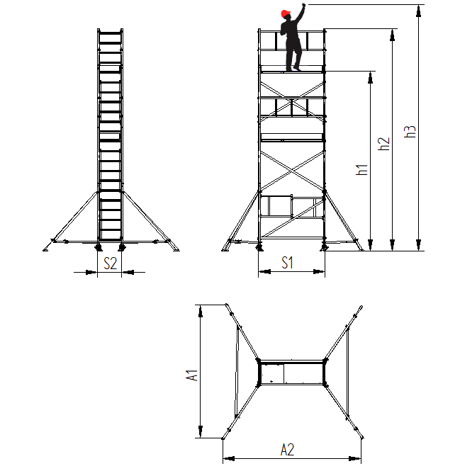 - Rusztowanie posiada dwa podesty antypoślizgowe o wymiarach roboczych 0,6 m x 1,8 m, umieszczone na wysokościach 3,5 m oraz 5,3 m.