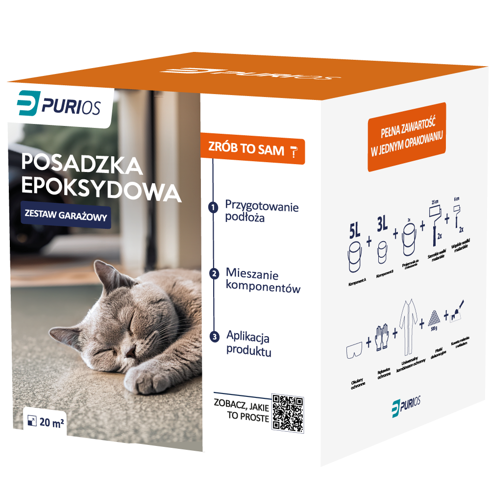 Purios Epoxy Floor jest to kompletne rozwiązanie „zrób to sam” (DIY), które pozwala na samodzielne wykonanie trwałej, estetycznej i odpornej posadzki epoksydowej w garażu lub innym pomieszczeniu. Jedno opakowanie wystarcza na pokrycie powierzchni do 20 m².