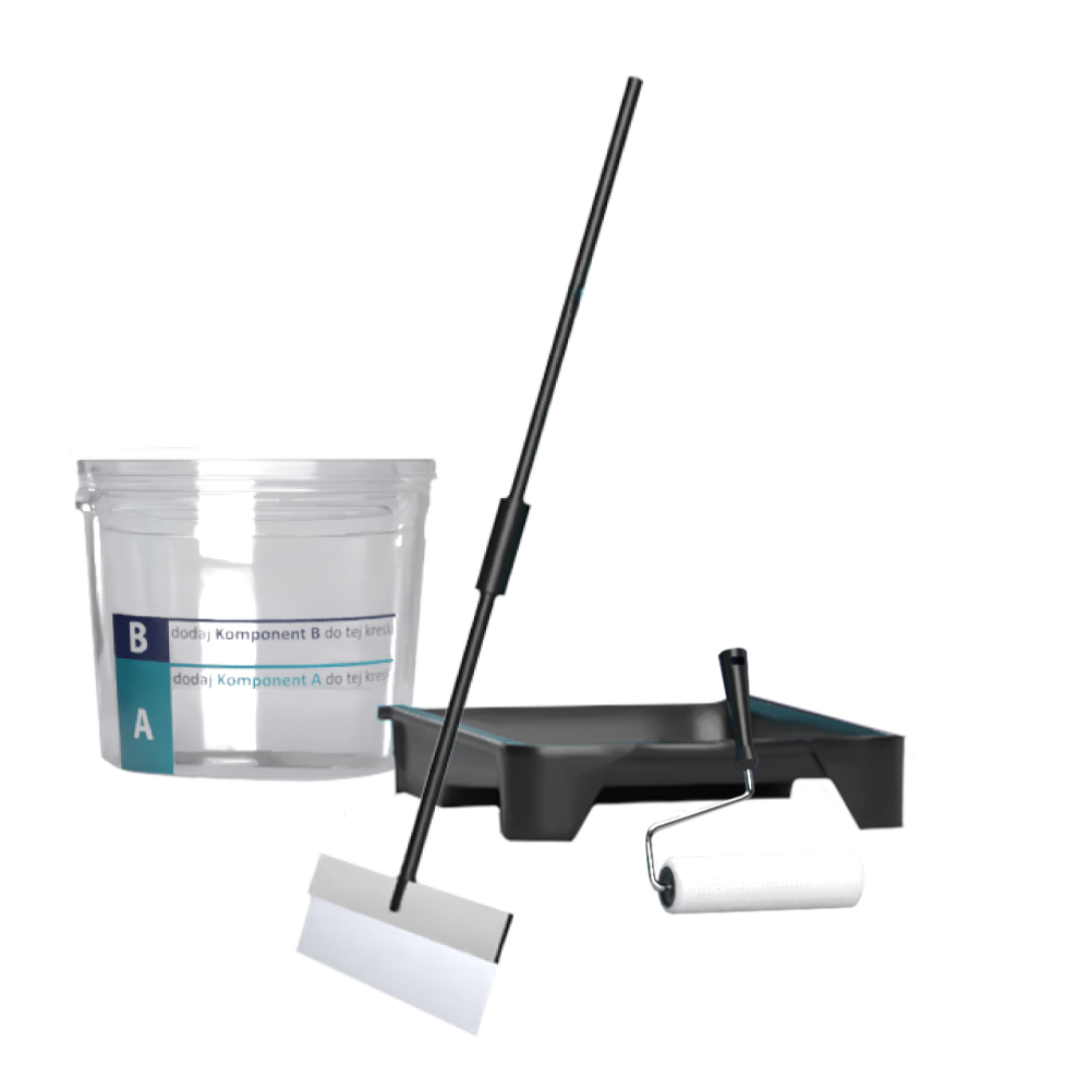 - Aplikacja — pierwszą warstwę nanieść wałkiem. Po 16–20 godzinach, nałożyć drugą warstwę dla uzyskania równomiernej i trwałej powłoki.